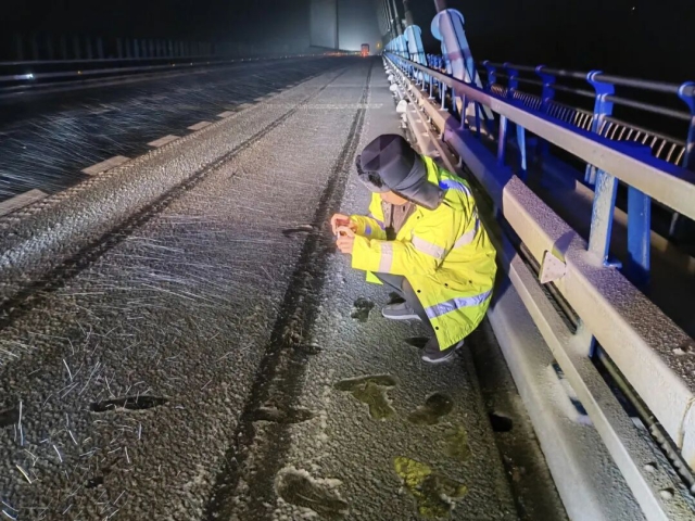 徐明中心五河分中心工作人員查看淮河特大橋橋面積水結冰情況