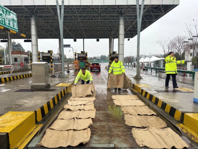 蕪湖中心南陵西站工作人員在車道鋪設防滑麻袋