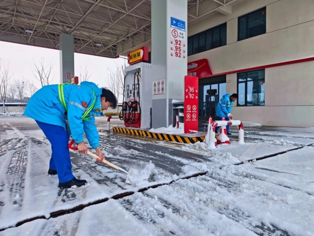 交控石油公司呂寨服務區(qū)加油站員工清掃站內(nèi)積雪