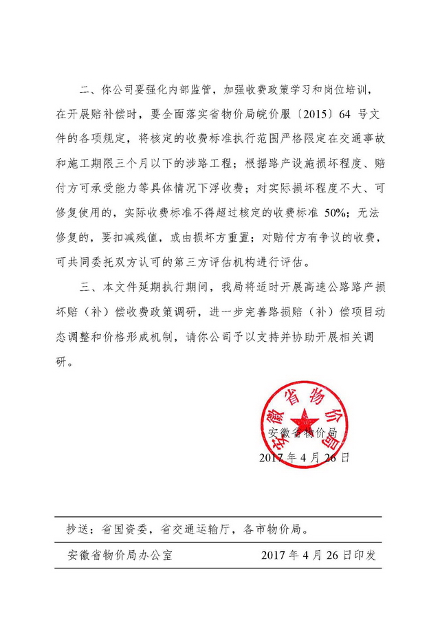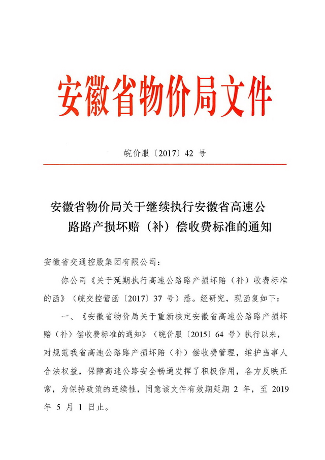 安徽省物價局關(guān)于繼續(xù)執(zhí)行安徽省高速公路路產(chǎn)損壞賠(補)償收費標(biāo)準(zhǔn)的通知